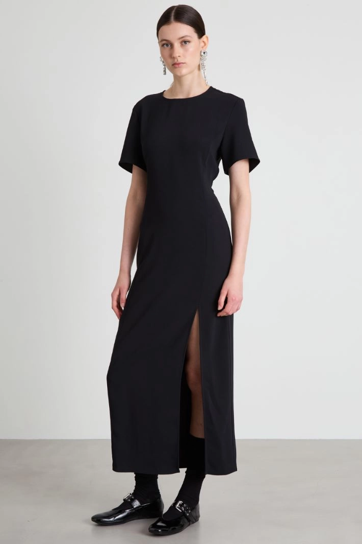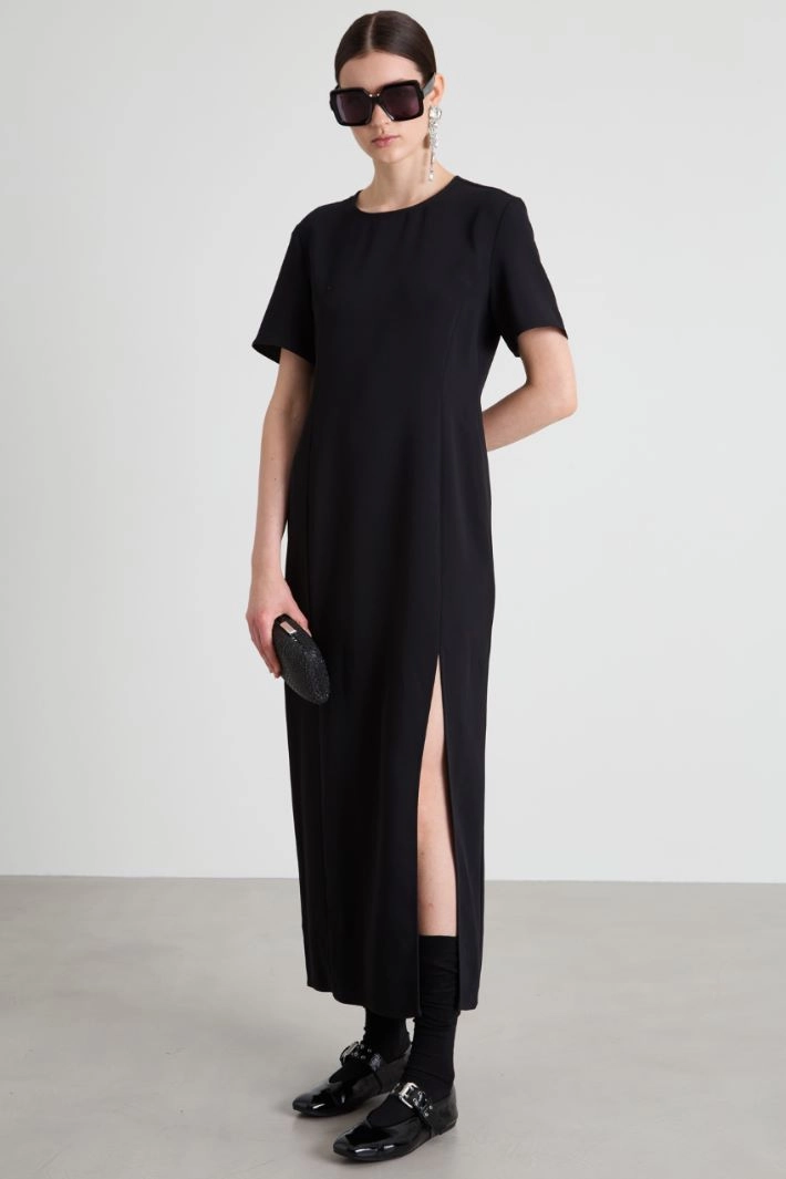 Semi-fitted long dress in flowing crepe with asymmetrical slit on the front, round neckline, short sleeves and invisible zip fastening on the back. Unlined model.