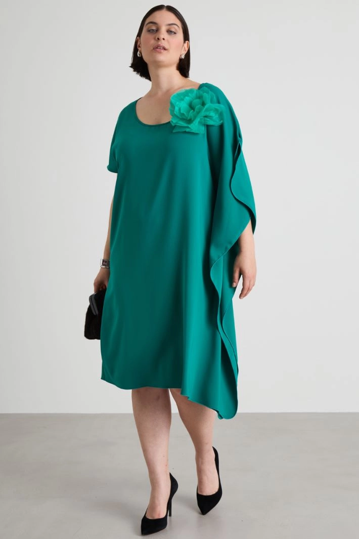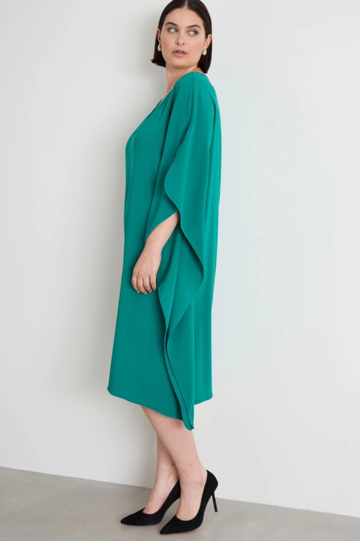 Loose-fit dress in stretch cady, with rounded neckline, asymmetrical kimono sleeves and slit on the shoulder.