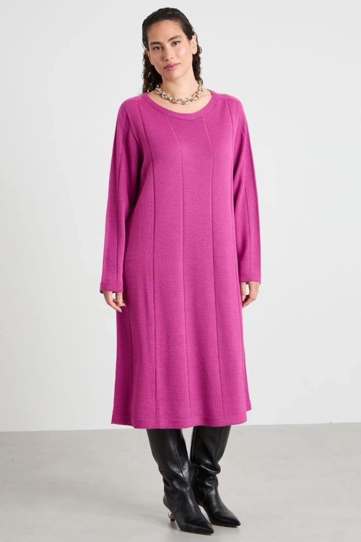 Straight-cut dress in wool blend knit, with a raised pattern that creates a striped effect, boat neckline and long sleeves.