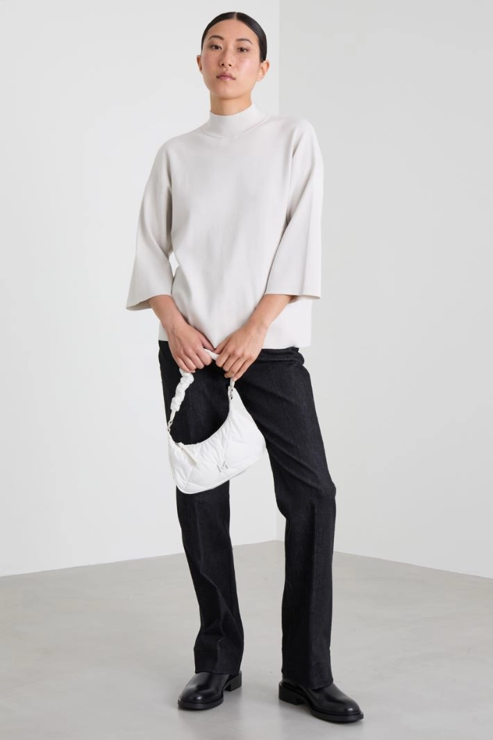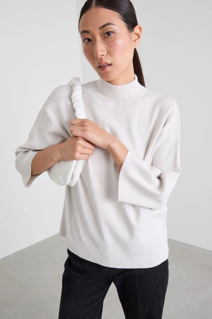 Straight-cut sweater in viscose blend yarn, with a high neck and three-quarter length flared sleeves with dropped shoulders.