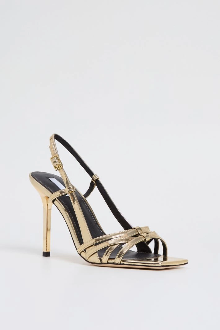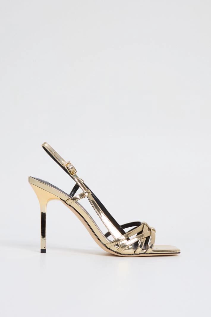 Sandals in mirror-effect coated fabric, with thin straps, square toe, thin heel and adjustable ankle strap closure. Leather lining, leather sole.