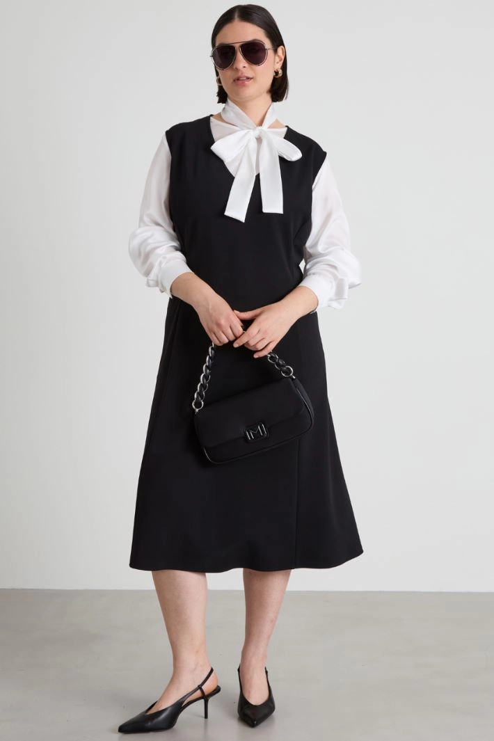 Sleeveless, flared dress in stretch crepe jersey, with V-neck and invisible zip fastening on the back.