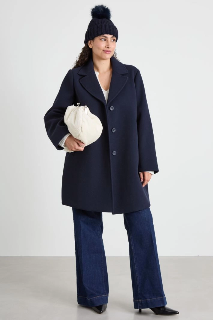 Straight-fit coat in cloth with padded insert on the back, lapel collar, long sleeves and welt pockets. Button fastening. Lined.