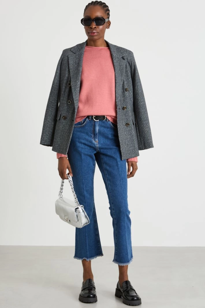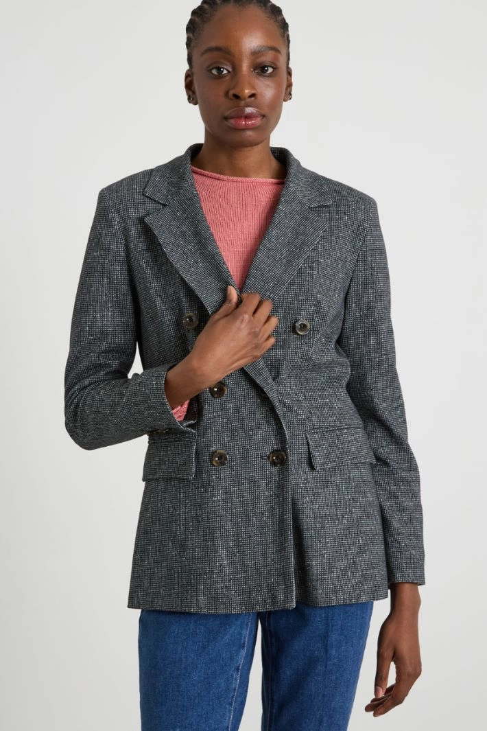 Semi-fitted blazer in stretch cotton jersey, with lapel collar, long sleeves with buttons and flap pockets on the sides. Double-breasted fastening with buttons. Lined.