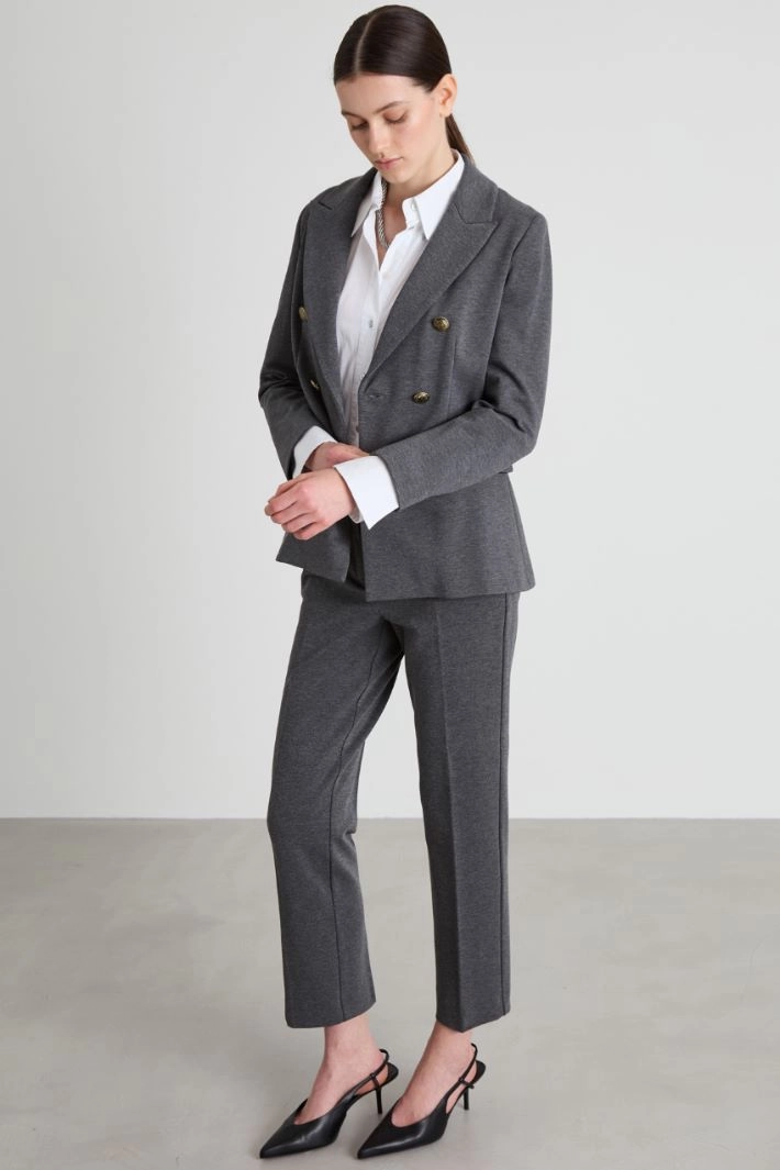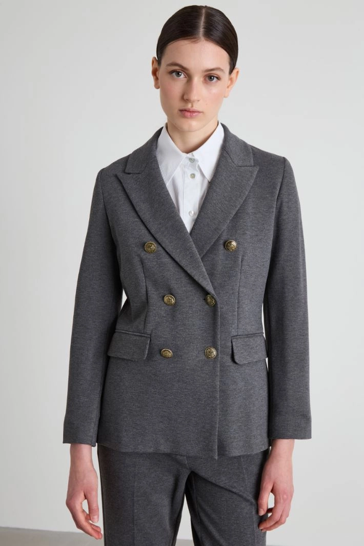 Fitted blazer in stretch viscose blend jersey, with peak lapel, long sleeves, double-welt side pockets with flap and double-breasted button fastening. Lined.