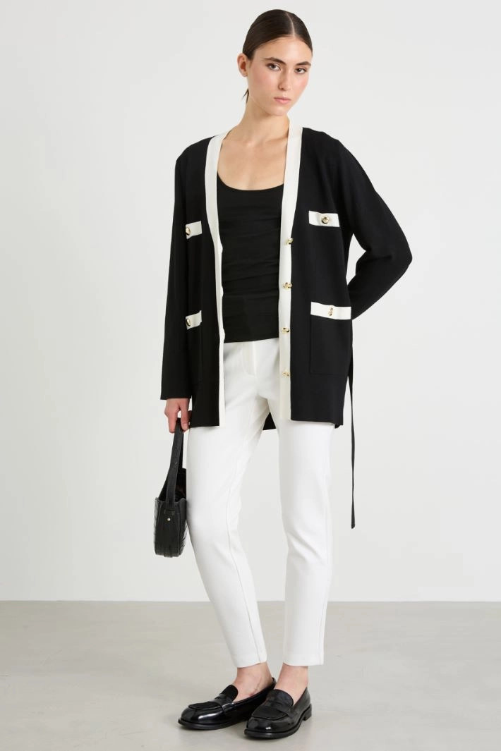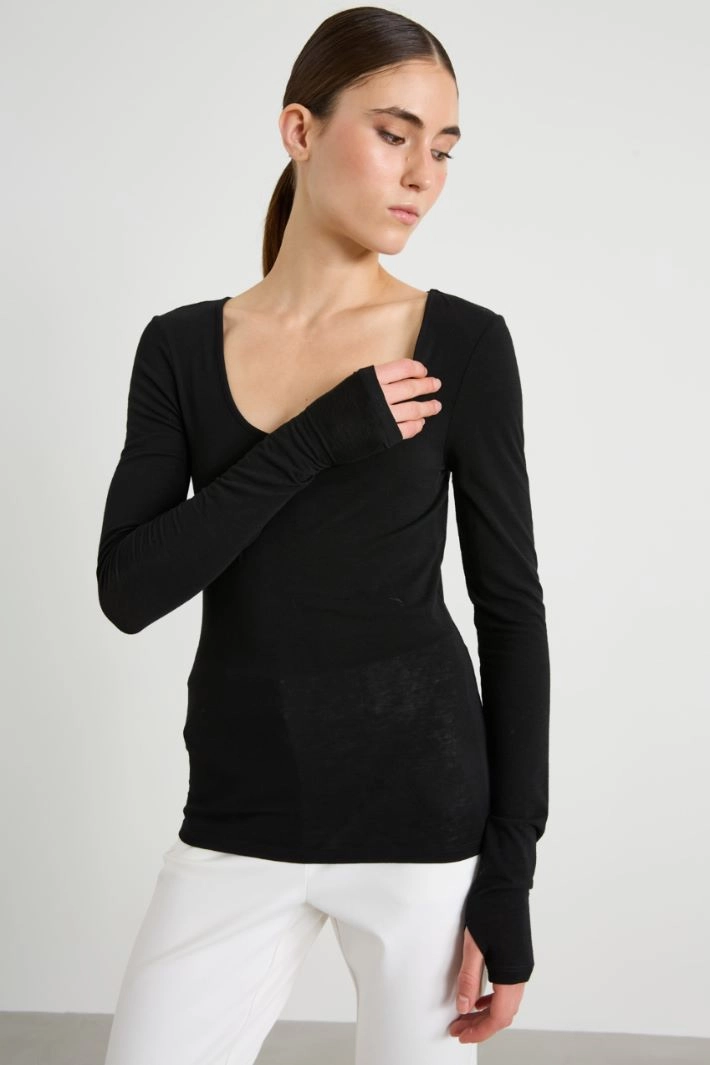 Fitted sweater in stretch wool blend fabric, with a wide round neckline and long sleeves with hole detail.
