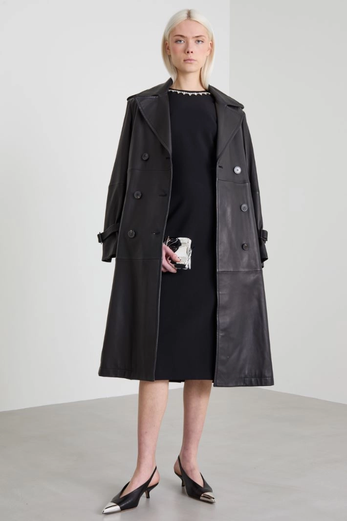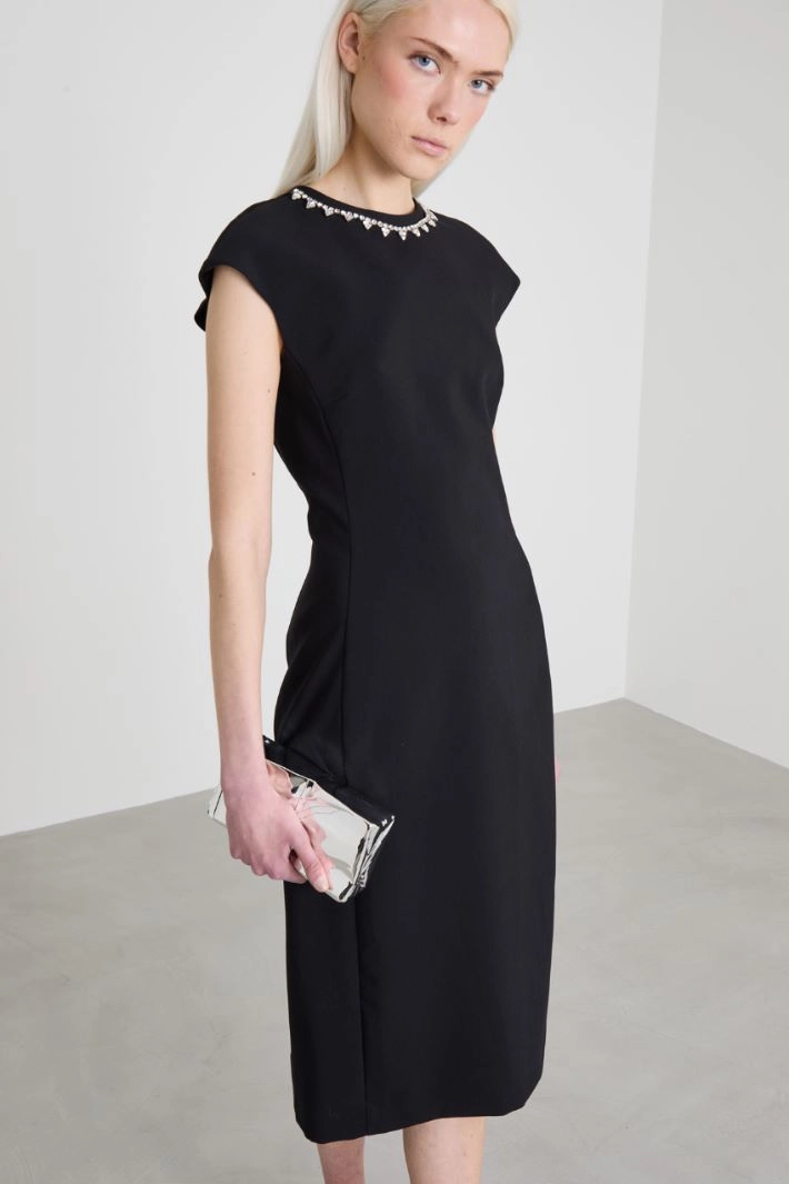 Sheath cady dress with a scoop neckline embellished with embroidered crystals and a central slit on the back. Invisible zip fastening on the back. Lined.