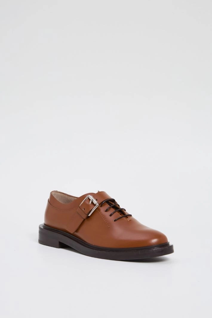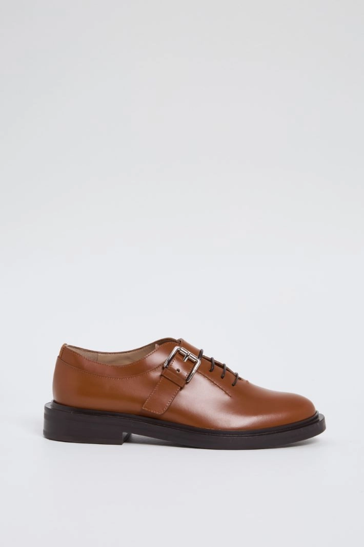 Lace-up shoes in genuine leather with rounded toe and adjustable strap on the instep. Lace-up fastening. Leather lining, rubber sole.