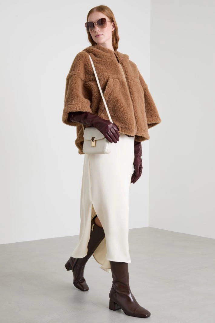 Boxy cape in camel and silk plush fabric, with pure cashmere drap inserts, hood, short kimono sleeves and side kangaroo pockets. Side openings with button and zip fastening. Lined.