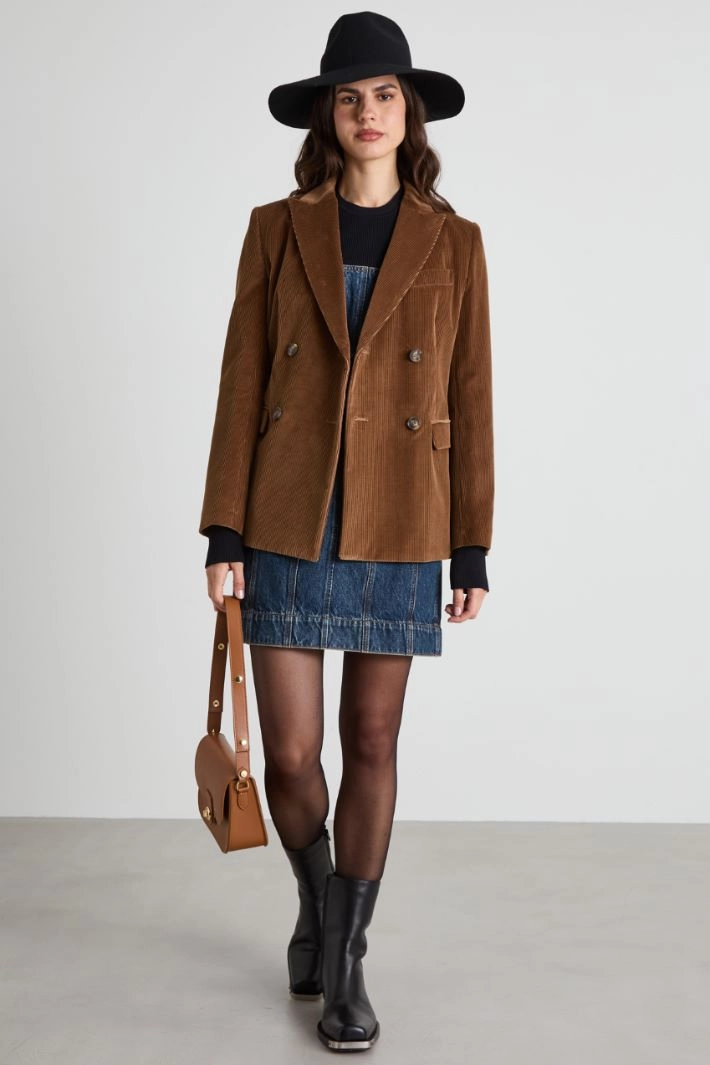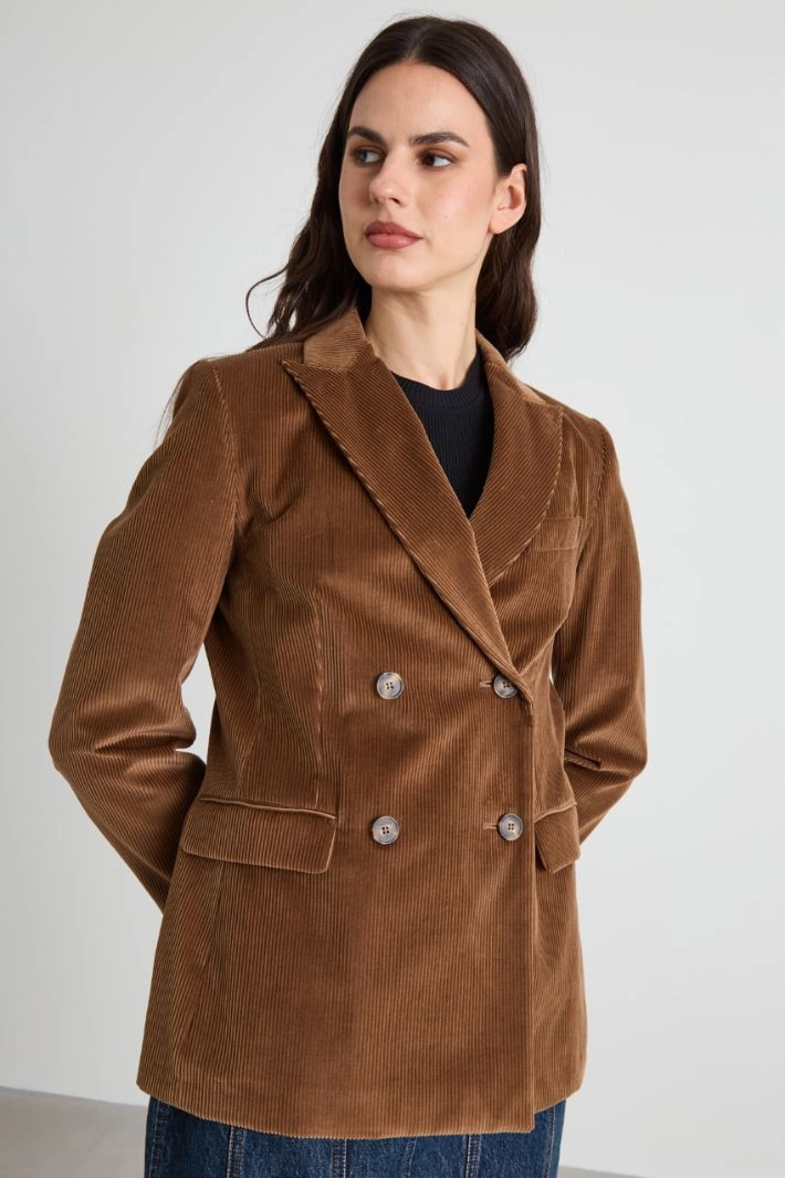 Straight-fit blazer in pure cotton corduroy, with lapel collar, long sleeves with buttons, double-welt side pockets with flap and central vent on the back. Double-breasted fastening with buttons. Lined.