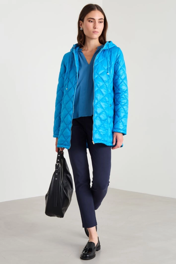 Straight and loose blouse in silk-blend crepe de chine, with Mandarin collar and V-neck, gathered motif on the shoulders and long sleeves with cuffs and button.