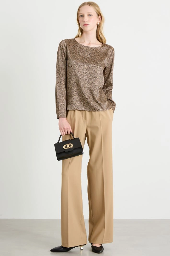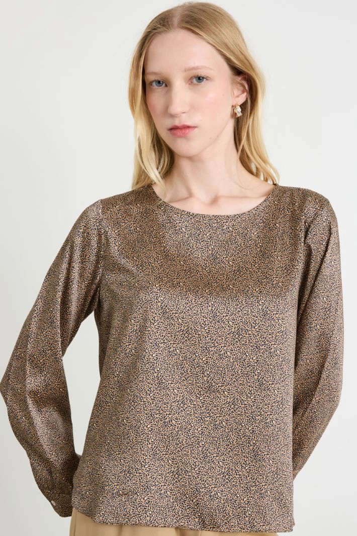 Flowing blouse in all-over printed twill, with round neckline, long sleeves with cuff and button, and asymmetrical hem that is longer at the back.