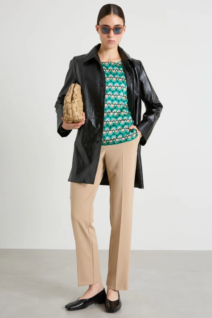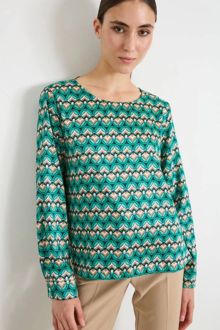 Flowing blouse in all-over printed twill, with round neckline, long sleeves with cuff and button, and asymmetrical hem that is longer at the back.