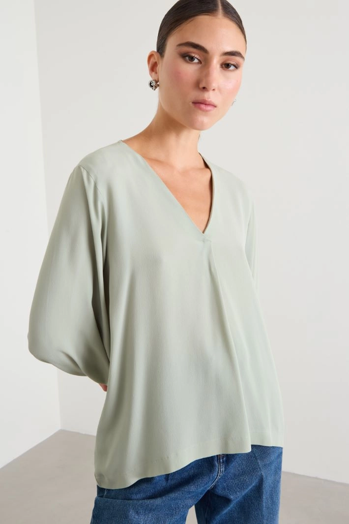 Loose-fit blouse in silk-blend crepe de chine, with a V-neck and long sleeves with cuffs and button.