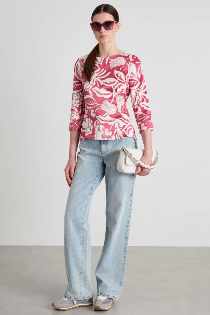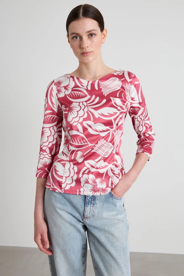 Semi-fitted blouse in printed stretch satin, with a boat neckline, three-quarter sleeves and a gathered motif on the chest. Invisible zip fastening on the centre back.
