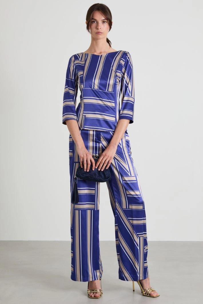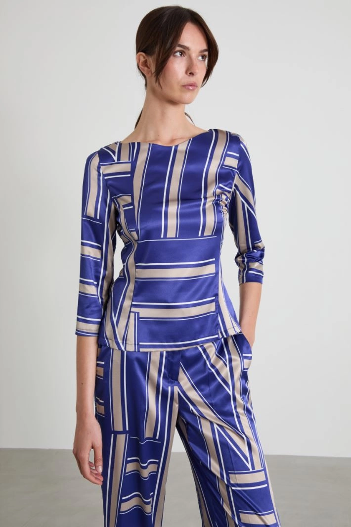 Semi-fitted blouse in printed stretch satin, with a boat neckline, three-quarter sleeves and a gathered motif on the chest. Invisible zip fastening on the centre back.