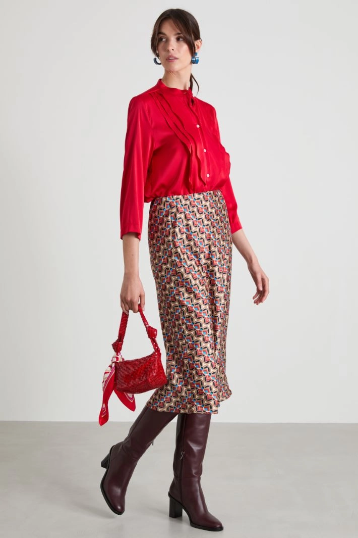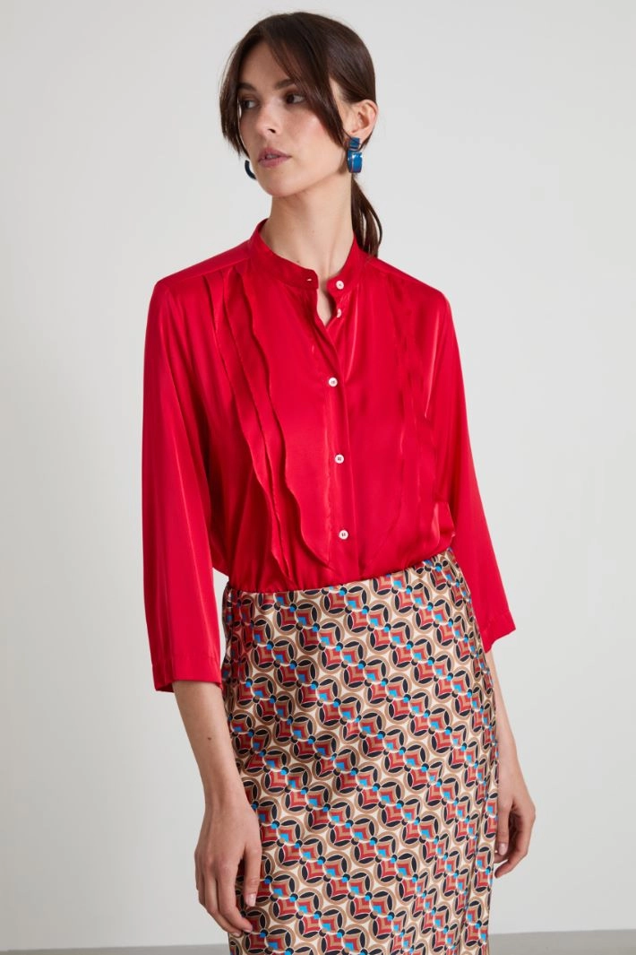 Straight-cut satin shirt with Mandarin collar, ruffle detail on the front, three-quarter sleeves and side slits at the bottom of the garment. Button fastening.