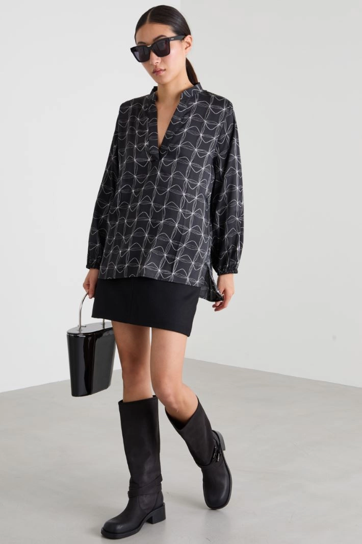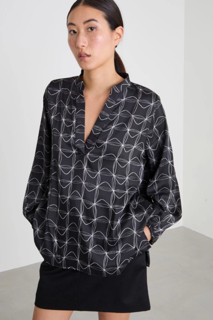 Loose-fitting blouse in printed twill, V-neck, long puff sleeves and gathered elastic cuffs. Longer back hem and side slits.