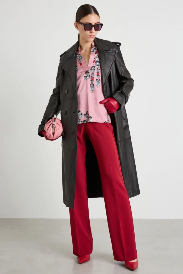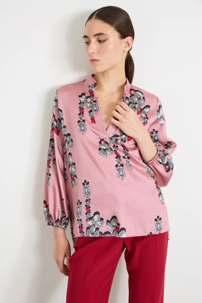 Loose-fitting blouse in printed twill, V-neck, long puff sleeves and gathered elastic cuffs. Longer back hem and side slits.