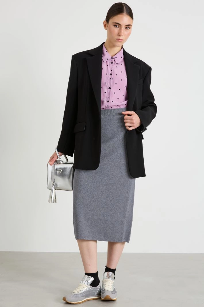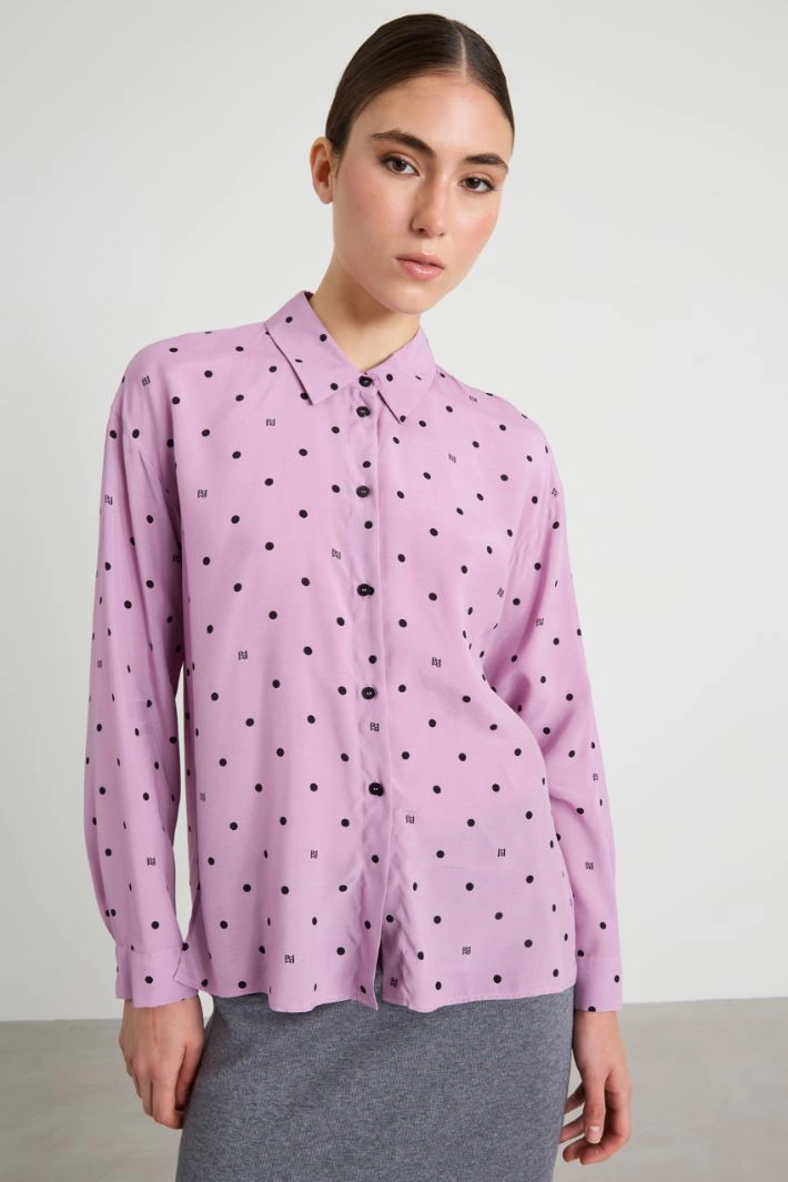 Straight-cut shirt in flowing pure viscose fabric, with classic collar, long sleeves with cuff and button, and a longer slit hem on the back. Button fastening.