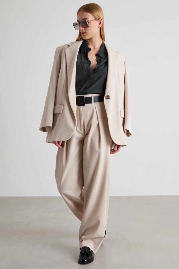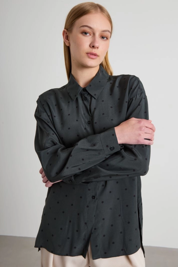 Straight-cut shirt in flowing pure viscose fabric, with classic collar, long sleeves with cuff and button, and a longer slit hem on the back. Button fastening.