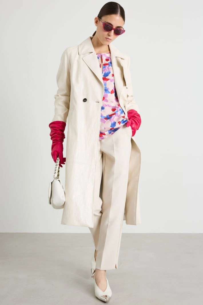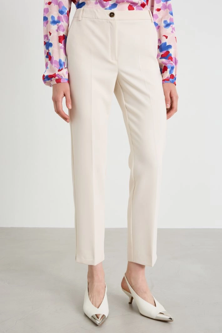 Cigarette trousers in double flowing canvas, with belt loops at the waist, French pockets at the front, crease ironed lengthwise and side slits at the bottom of the garment. Fastening with hidden zip and button.