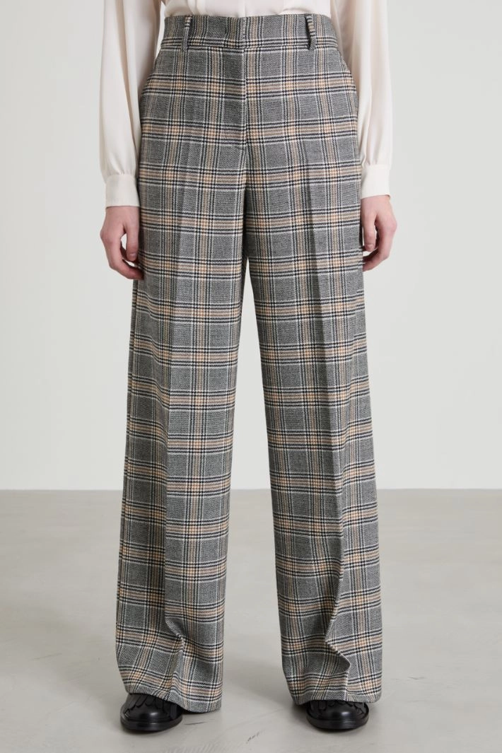 Palazzo trousers in pure yarn-dyed wool batavia, with belt loops at the waist, side French pockets and buttoned welt pockets at the back, and pressed crease lengthwise. Hidden fastening with zip, button and hook.