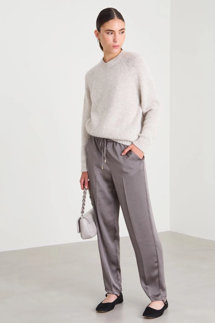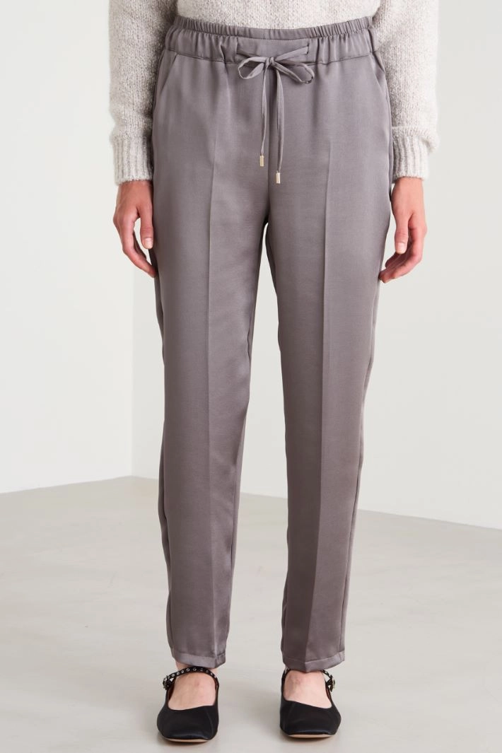 Loose-fit trousers in flowing fabric, elasticated waist with drawstring, side French pockets and crease along the front and back.