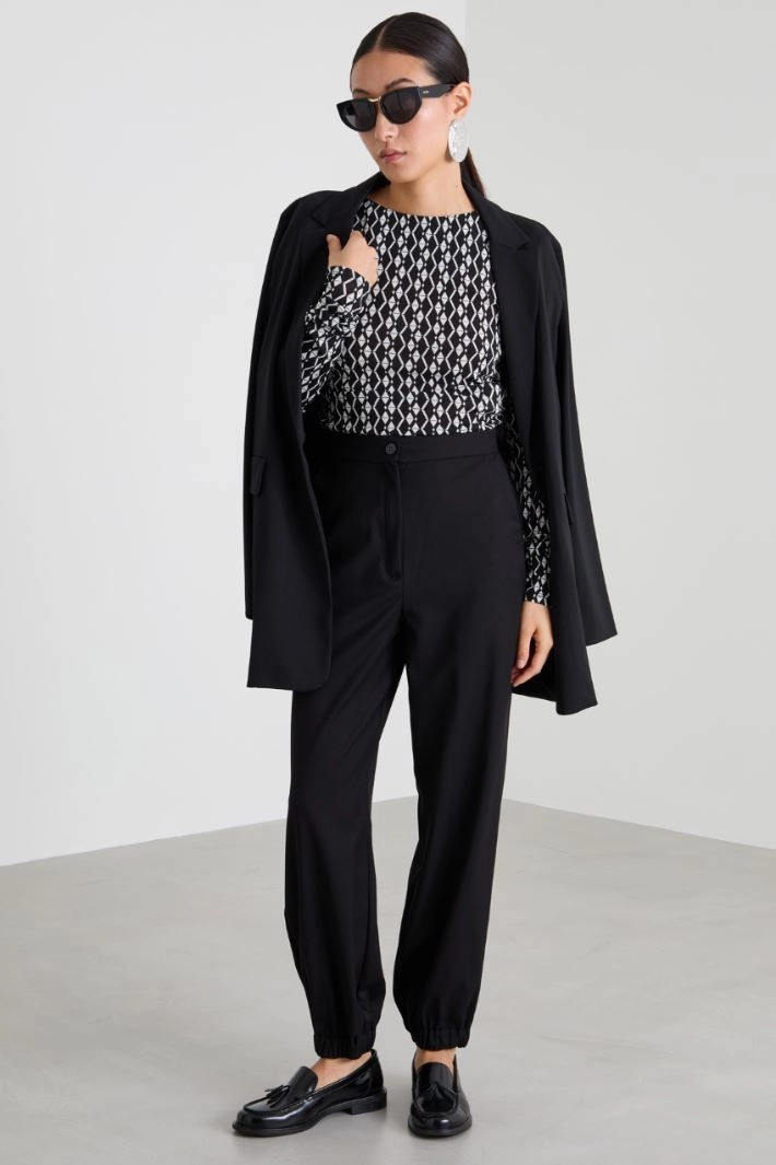 Loose-fit trousers in stretch viscose blend diagonal fabric, with French pockets and elastic cuffs at the bottom of the garment. Zip and button fastening.