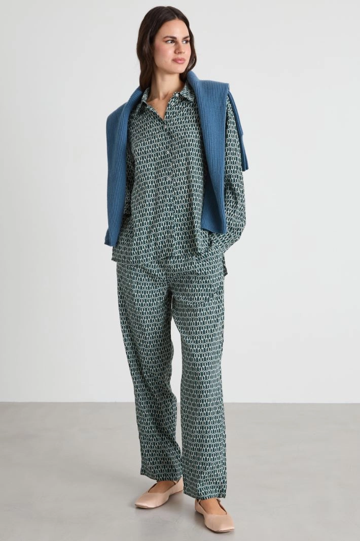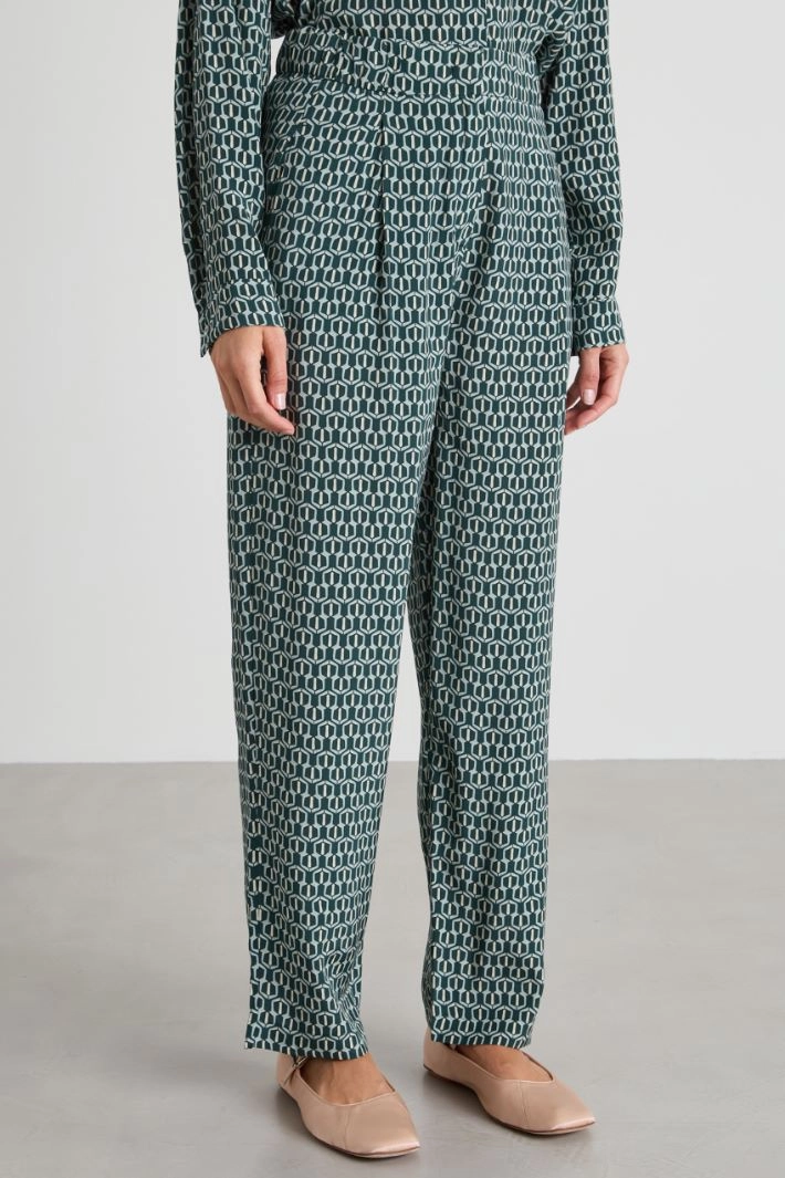 Baggy trousers in flowing pure viscose fabric printed all over, with elastic waist insert at the back, pleat motif, side pockets, pressed crease lengthwise. Hidden fastening with zip and snap button.