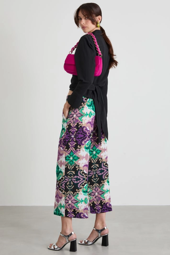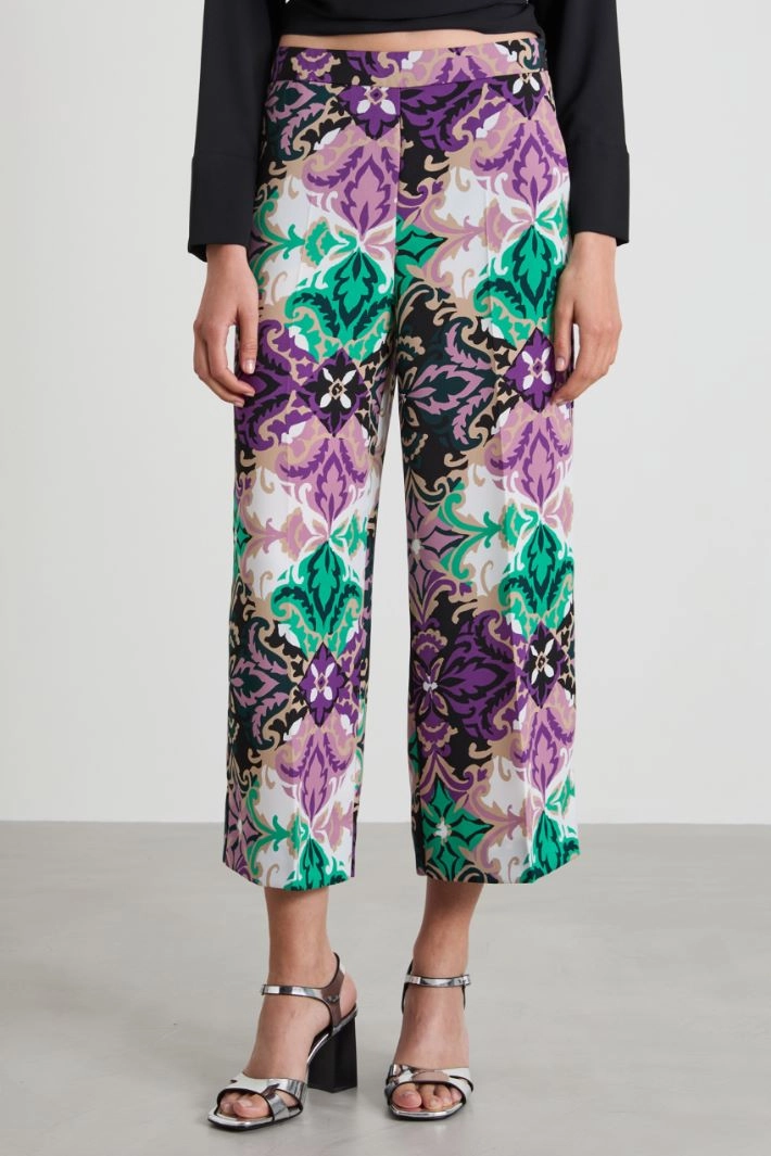 Straight-cut trousers in printed flowing fabric, with French pockets on the front and pressed crease along the length. Invisible zip fastening on the side.