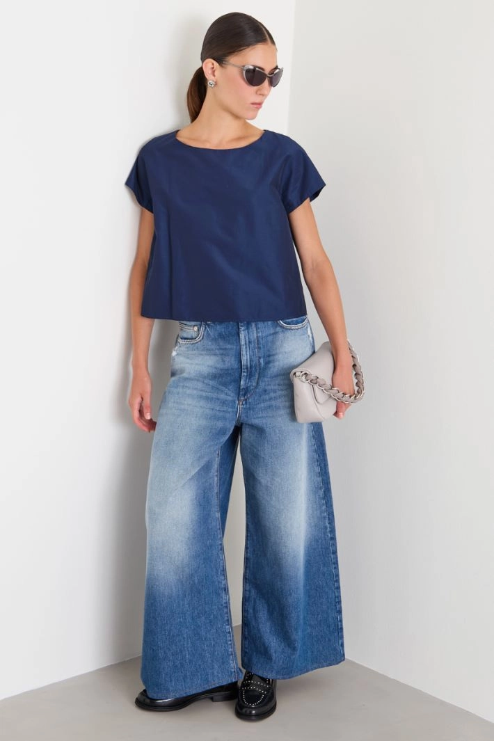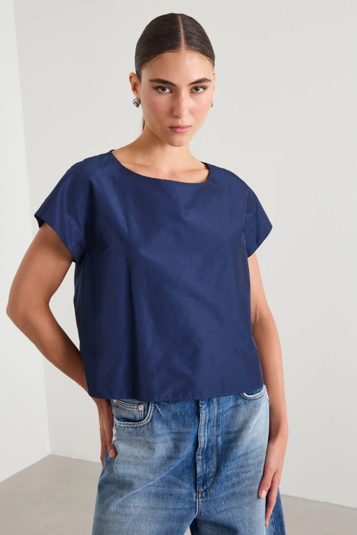 Straight-cut top in cotton blend taffeta, with crew neck, short sleeves and teardrop fastening with button on the back. Lined.