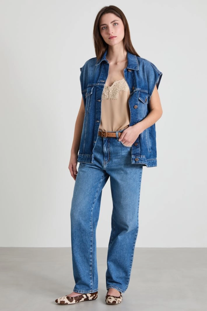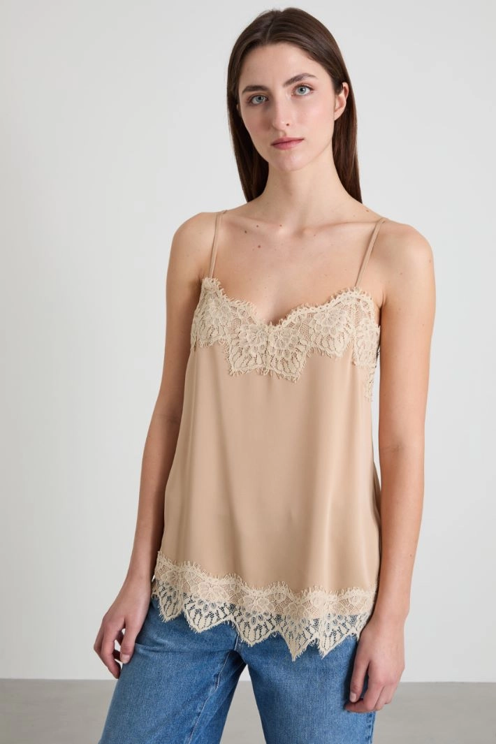 Slip satin top with matching lace inserts applied on the décolleté and bottom, and adjustable thin shoulder straps.