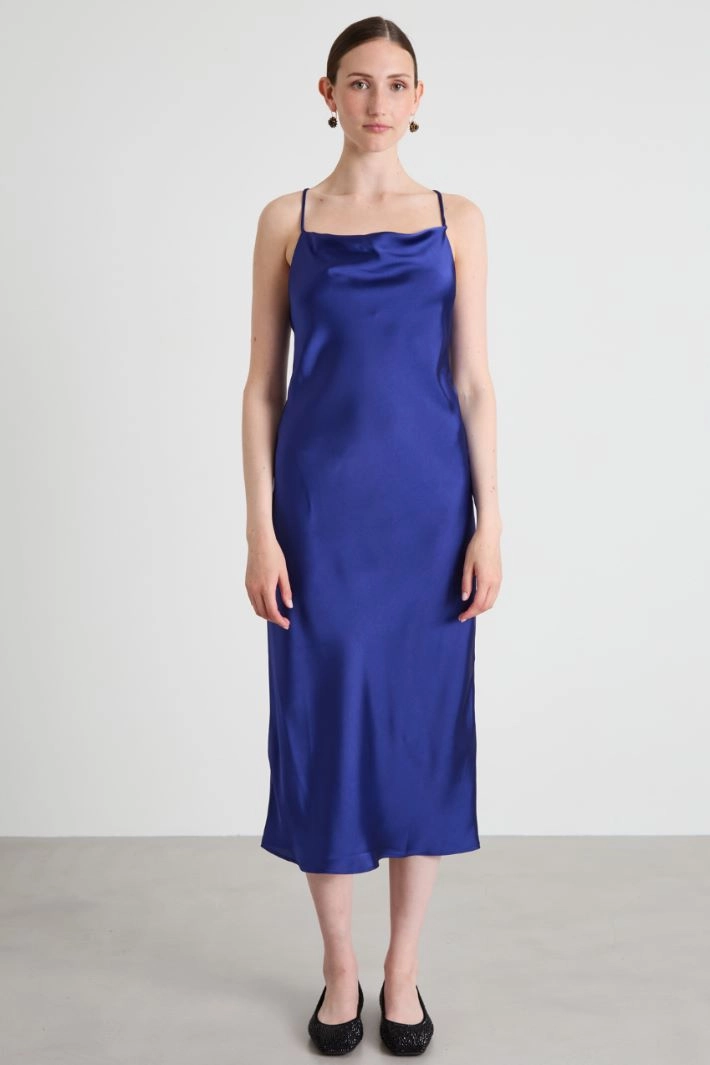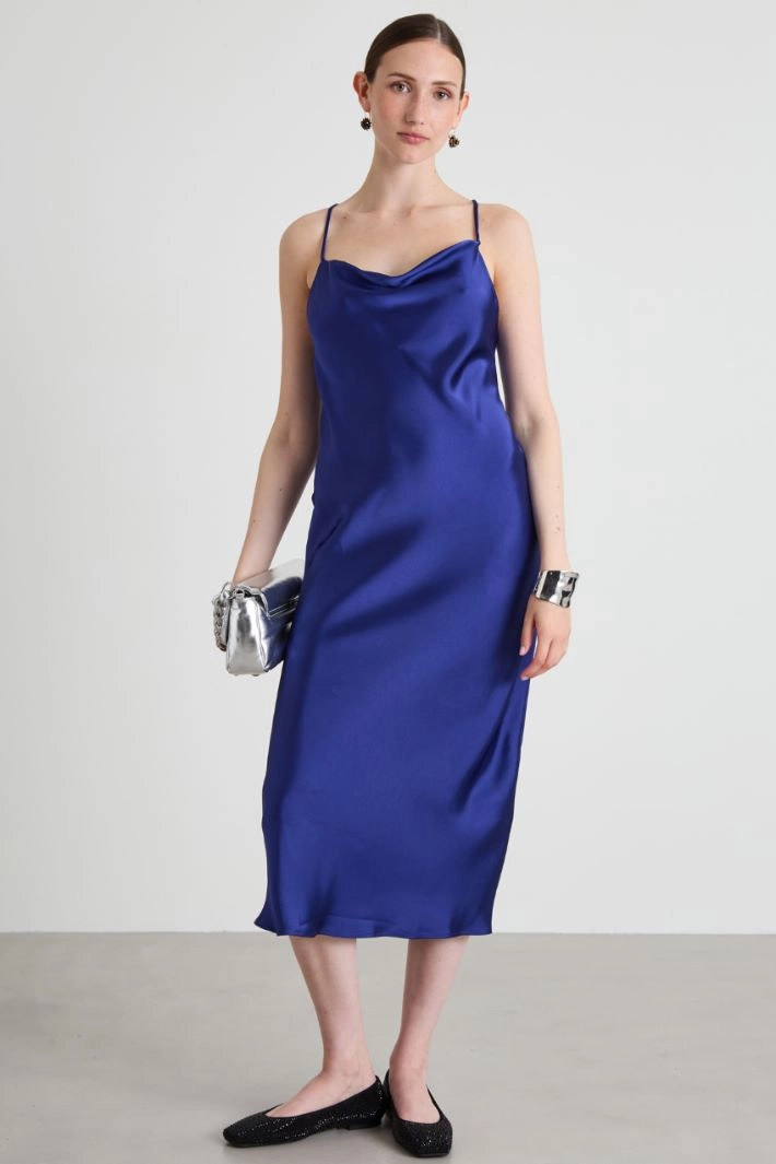 Vestido lencero de línea fluida realizado en satén, con escote drapeado y tirantes finos cruzados en la espalda.