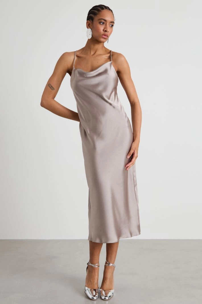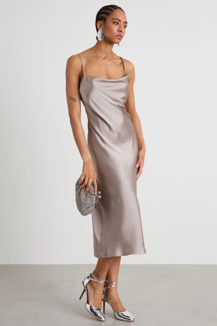 Vestido lencero de línea fluida realizado en satén, con escote drapeado y tirantes finos cruzados en la espalda.