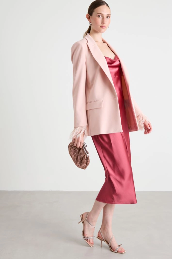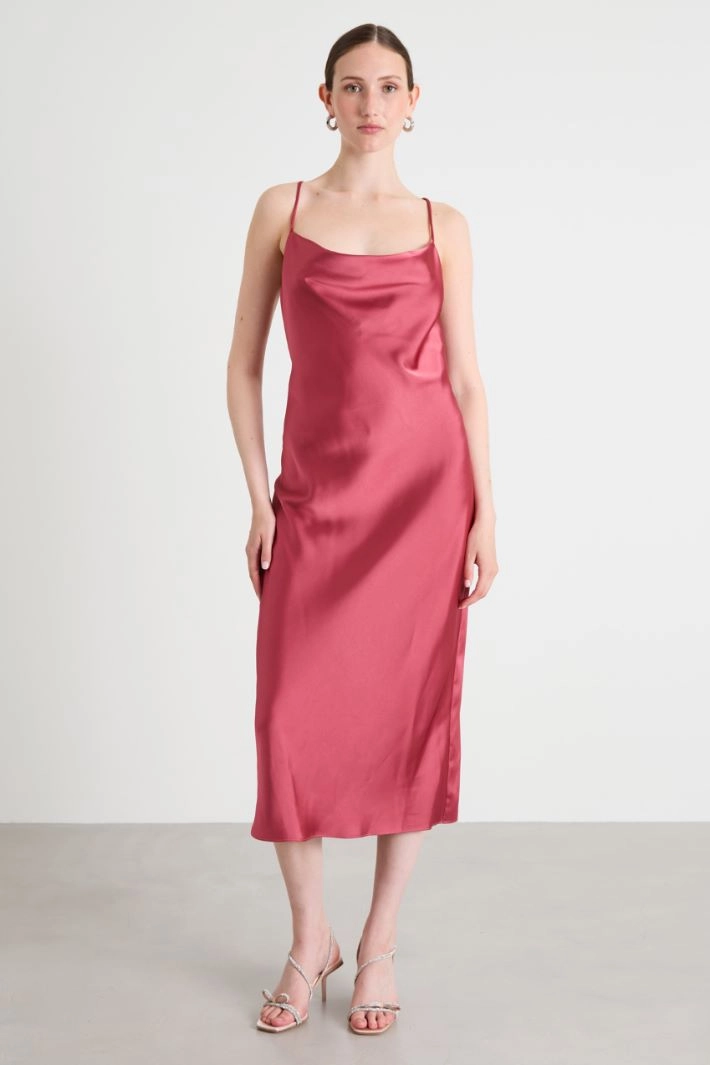 Vestido lencero de línea fluida realizado en satén, con escote drapeado y tirantes finos cruzados en la espalda.
