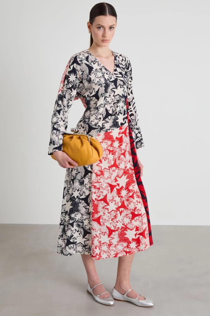 Flared patchwork dress in pure silk crepe, with a V-neck, long kimono sleeves and inset side pockets.Teardrop fastening with button and invisible zip on the back.
