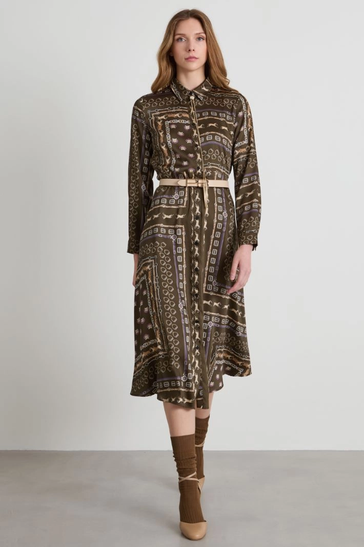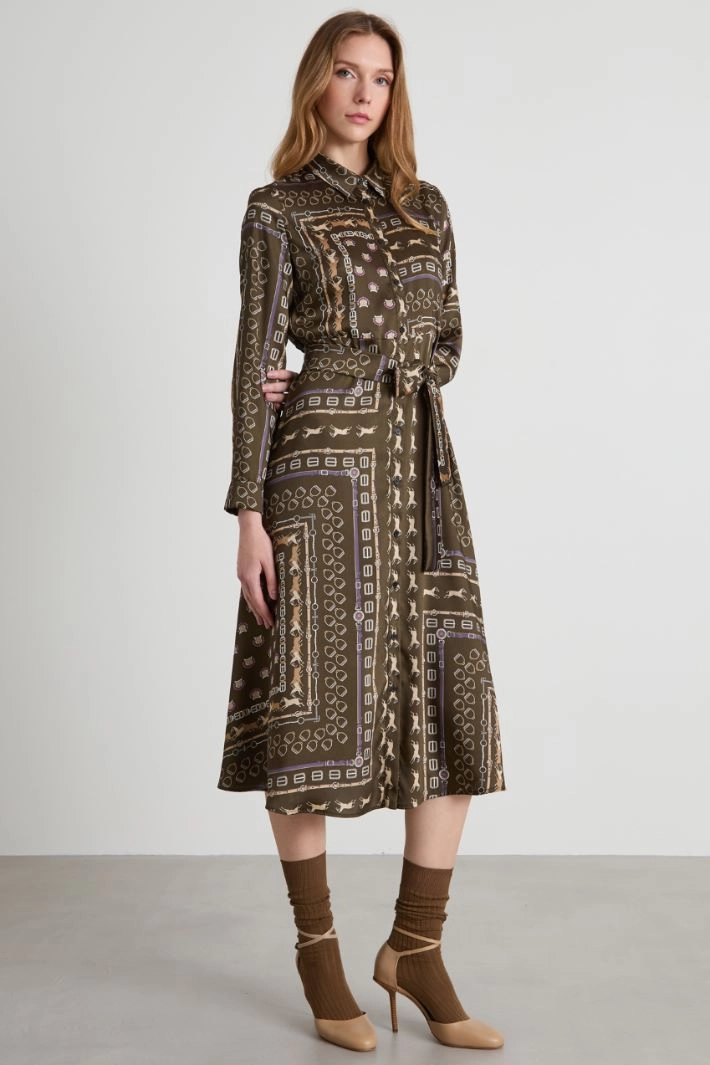 Flared shirt dress in all-over printed twill, with classic collar, long sleeves with cuff and button, and elastic waist insert on the back. Full-length button fastening. Matching sash.
