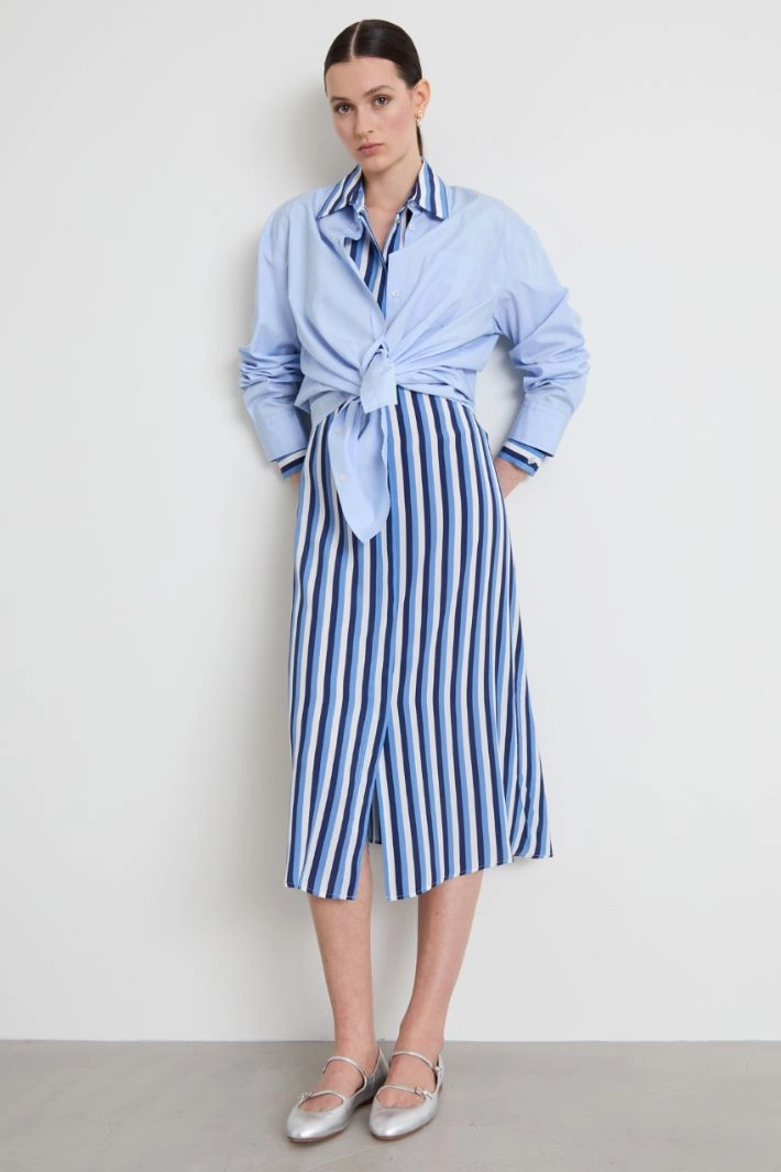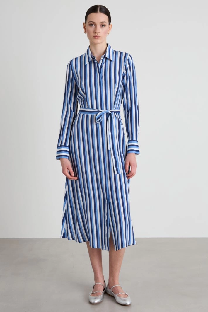 Loose-fitting dress in viscose satin, with a shirt collar, long sleeves with cuffs and buttons, a waistband and a matching belt. Fastened with hidden buttons.