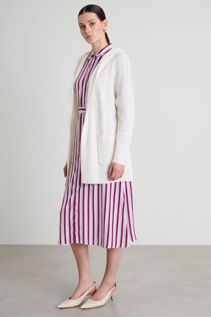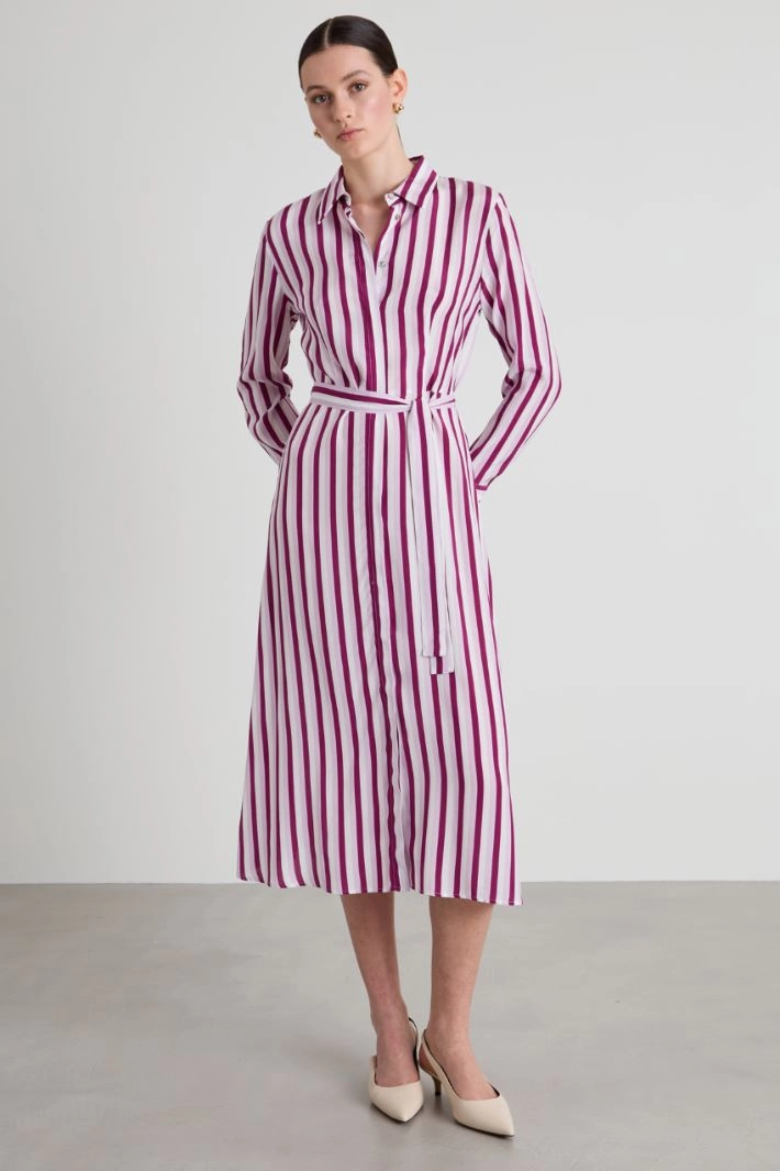 Loose-fitting dress in viscose satin, with a shirt collar, long sleeves with cuffs and buttons, a waistband and a matching belt. Fastened with hidden buttons.
