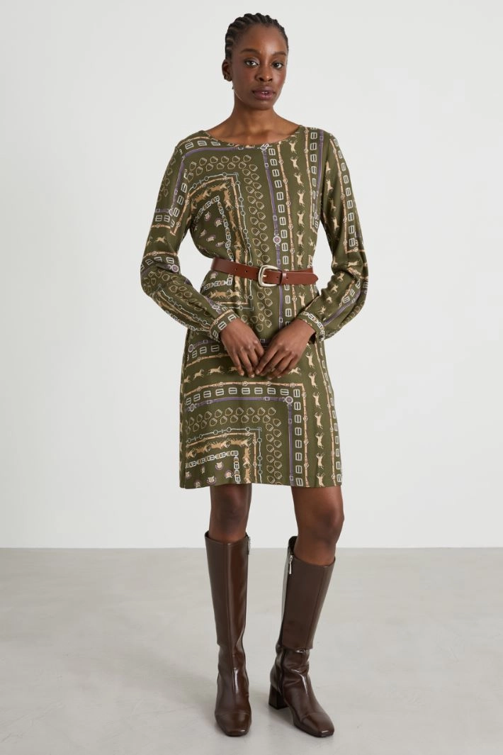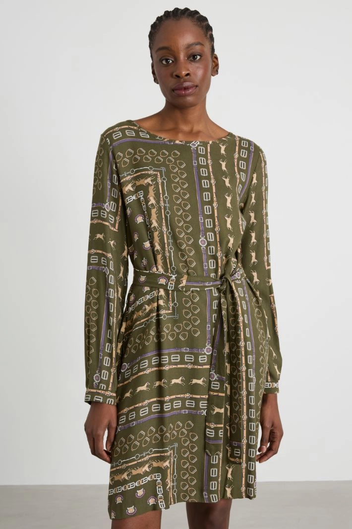 Straight-cut dress in printed viscose twill, with a boat neckline, long sleeves with cuffs and buttons, inset side pockets and a matching belt. Invisible zip fastening on the back.