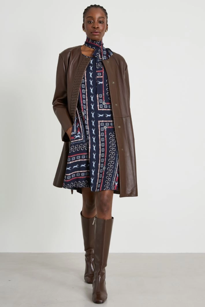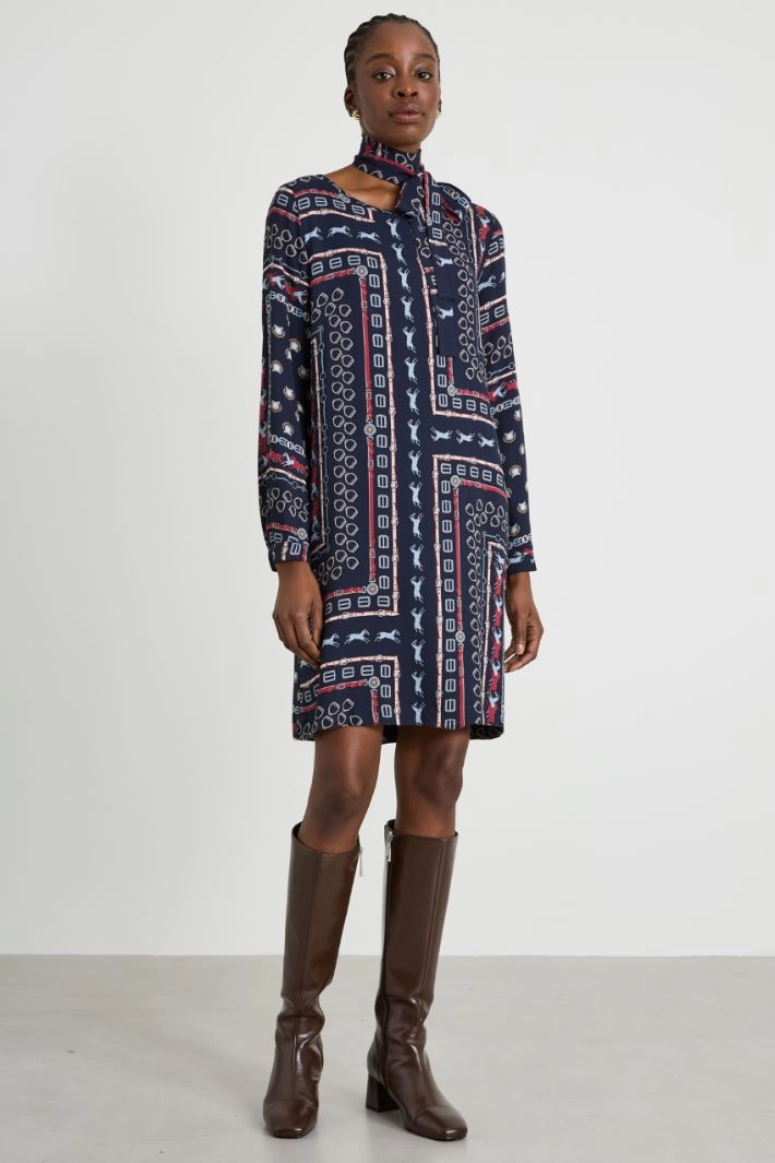 Straight-cut dress in printed viscose twill, with a boat neckline, long sleeves with cuffs and buttons, inset side pockets and a matching belt. Invisible zip fastening on the back.