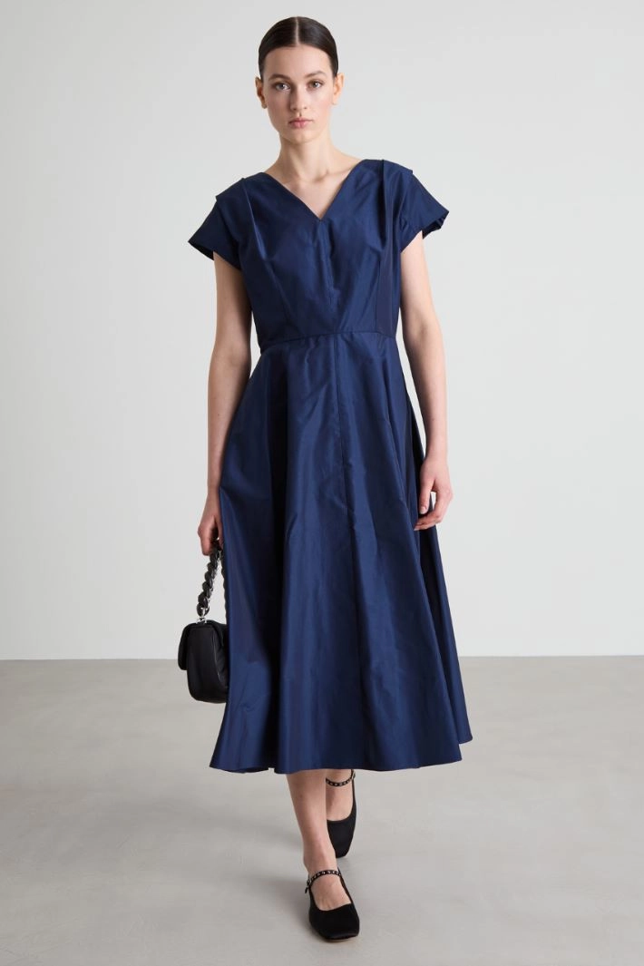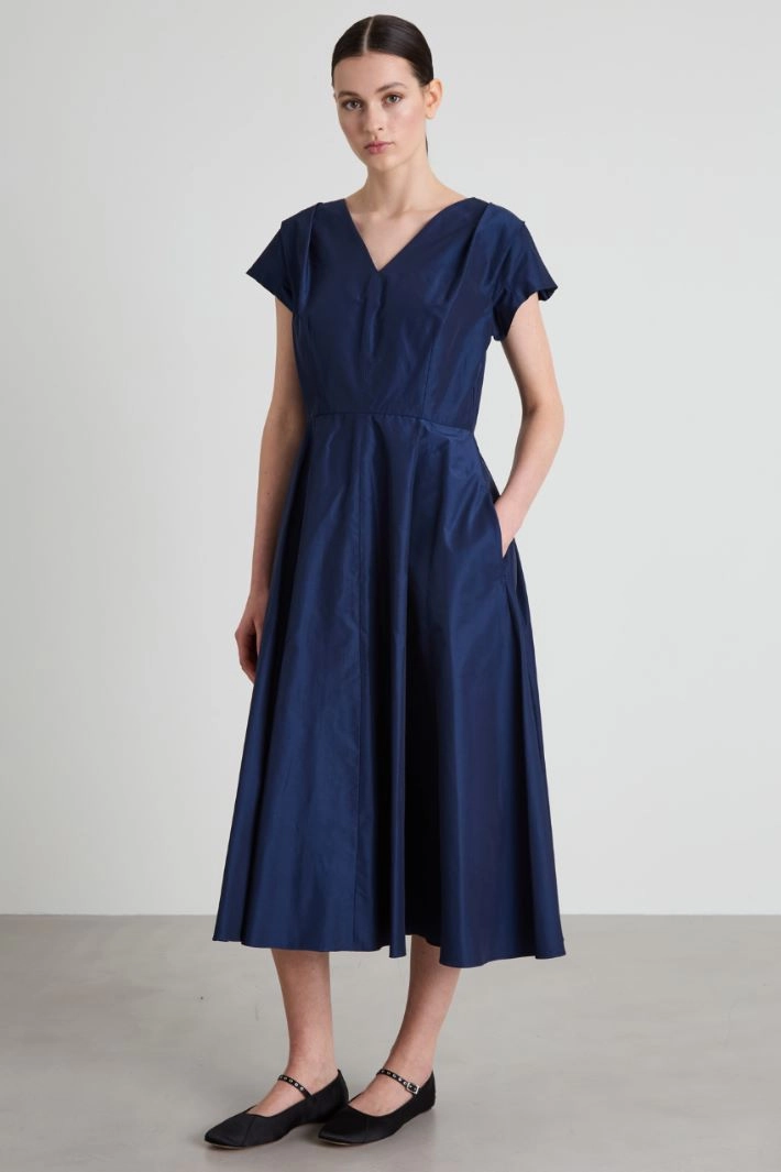 Flared dress in cotton blend taffeta, with V-neck, short kimono sleeves and inset pockets. Invisible zip fastening on the center back.
