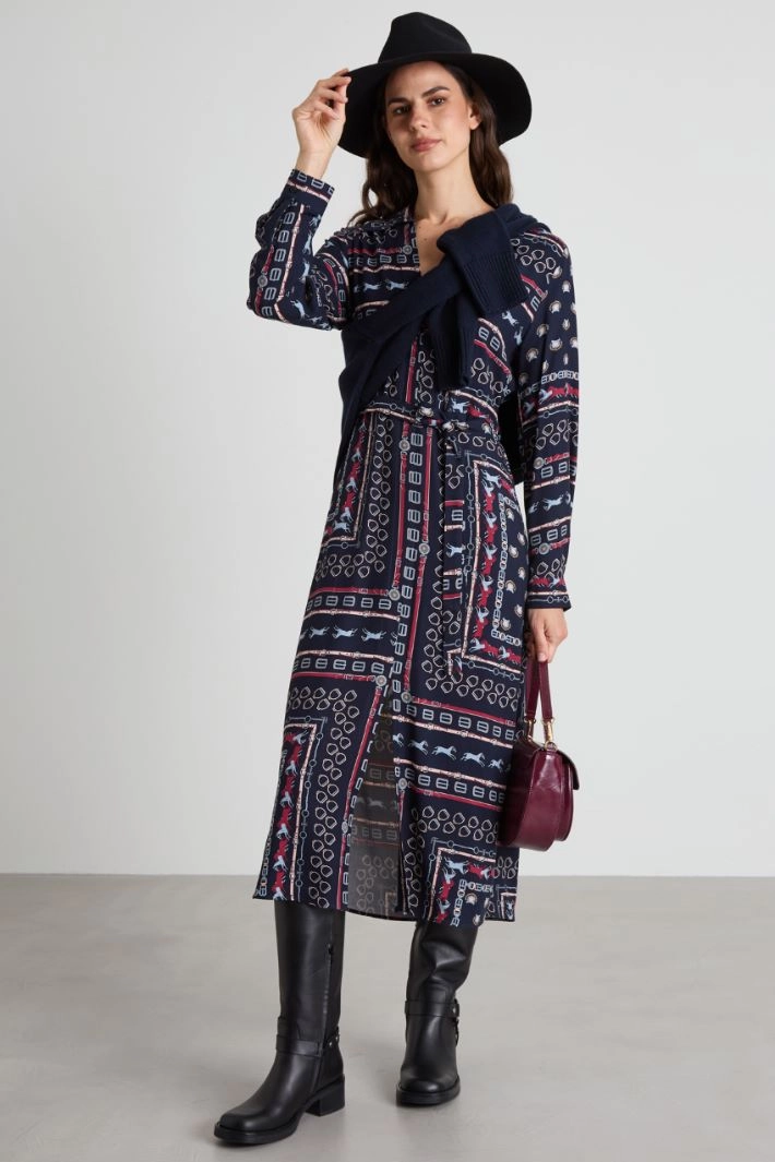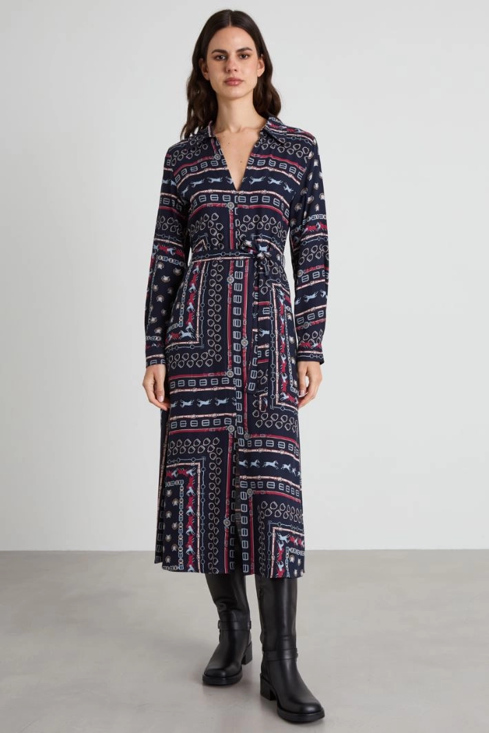 Straight-cut dress in printed pure viscose twill, with a classic collar and V-neckline, long sleeves with buttoned cuffs, and a central slit on the front. Counter-pleat motif and elastic waistband insert on the back. Matching sash.