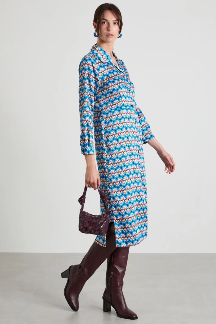 Flowing shirt dress in all-over printed twill, with classic collar, long sleeves with cuff and button, inset side pockets and slits at the bottom. Fastening with visible buttons. Matching sash.