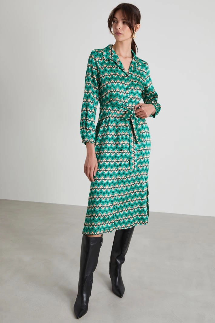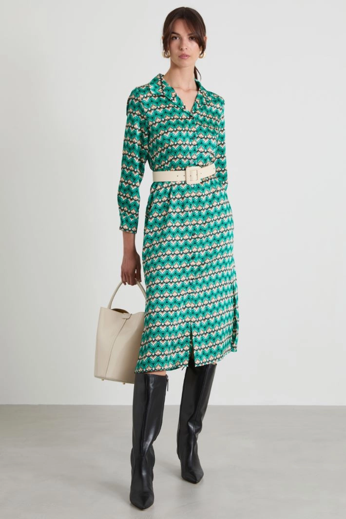 Flowing shirt dress in all-over printed twill, with classic collar, long sleeves with cuff and button, inset side pockets and slits at the bottom. Fastening with visible buttons. Matching sash.