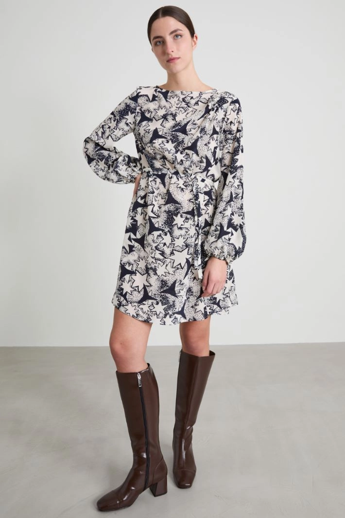 Flowing dress in pure silk crepe de chine printed all over, with a boat neckline, long puff sleeves with elastic cuffs and side pockets inserted in the seams. Matching sash.
