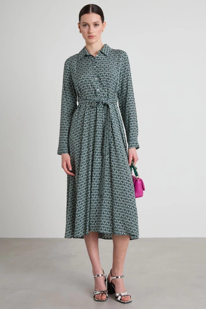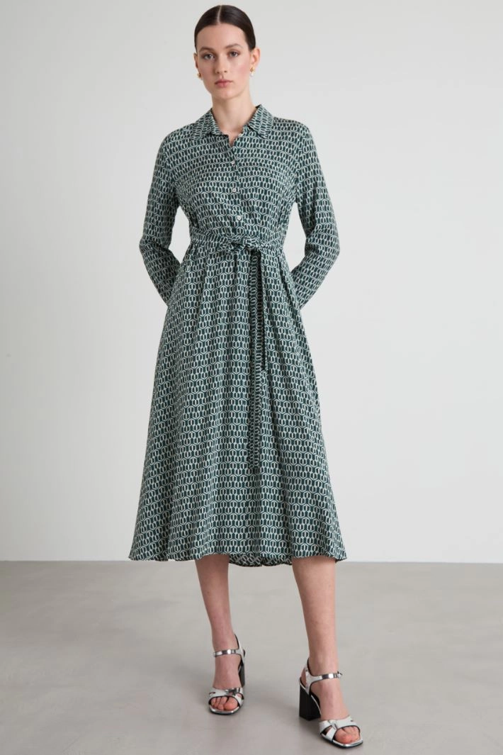 Straight-cut dress in viscose poplin, with shirt collar, long sleeves with cuff and button, elastic waistband insert on the back and matching belt. Button fastening.