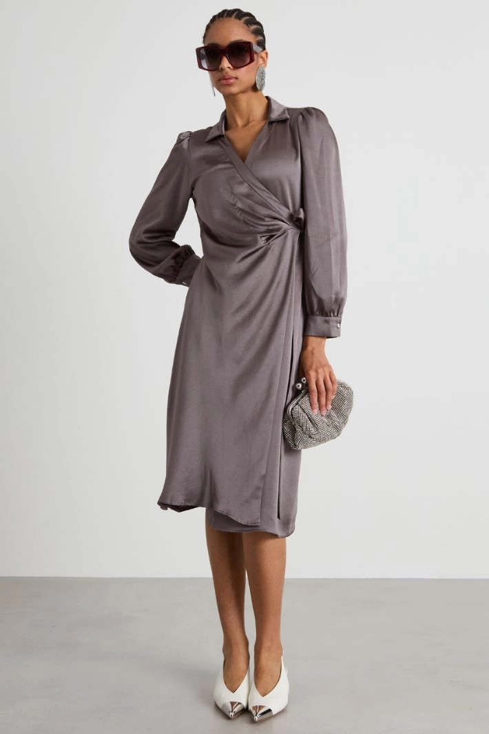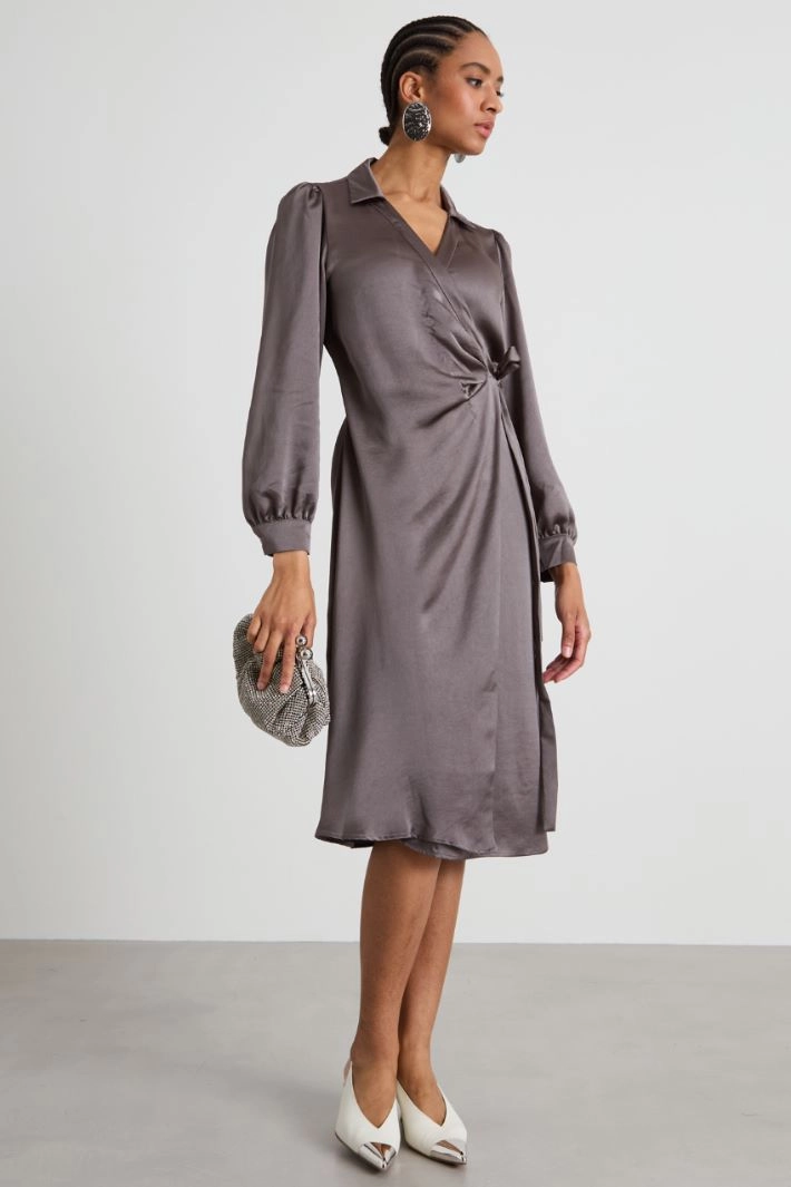 Loose-fitting dress in shiny fabric, with shirt collar, crossover V-neckline, long sleeves with cuff and button. Wrap fastening with drawstring on the side.