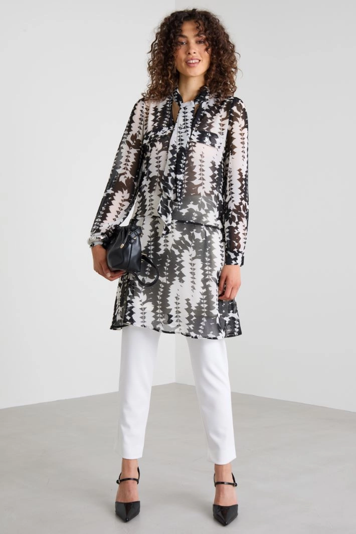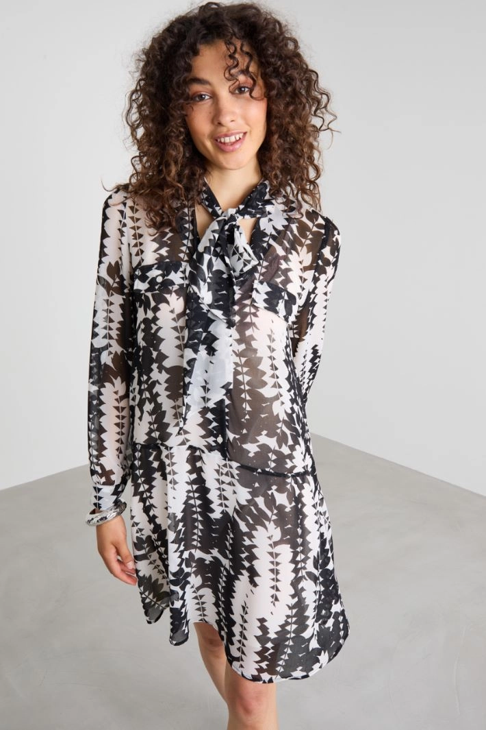 A-line dress in printed georgette, with a V-neckline and a sash to tie at the neck, and long sleeves with cuffs and buttons. Button fastening. Matching slip.
